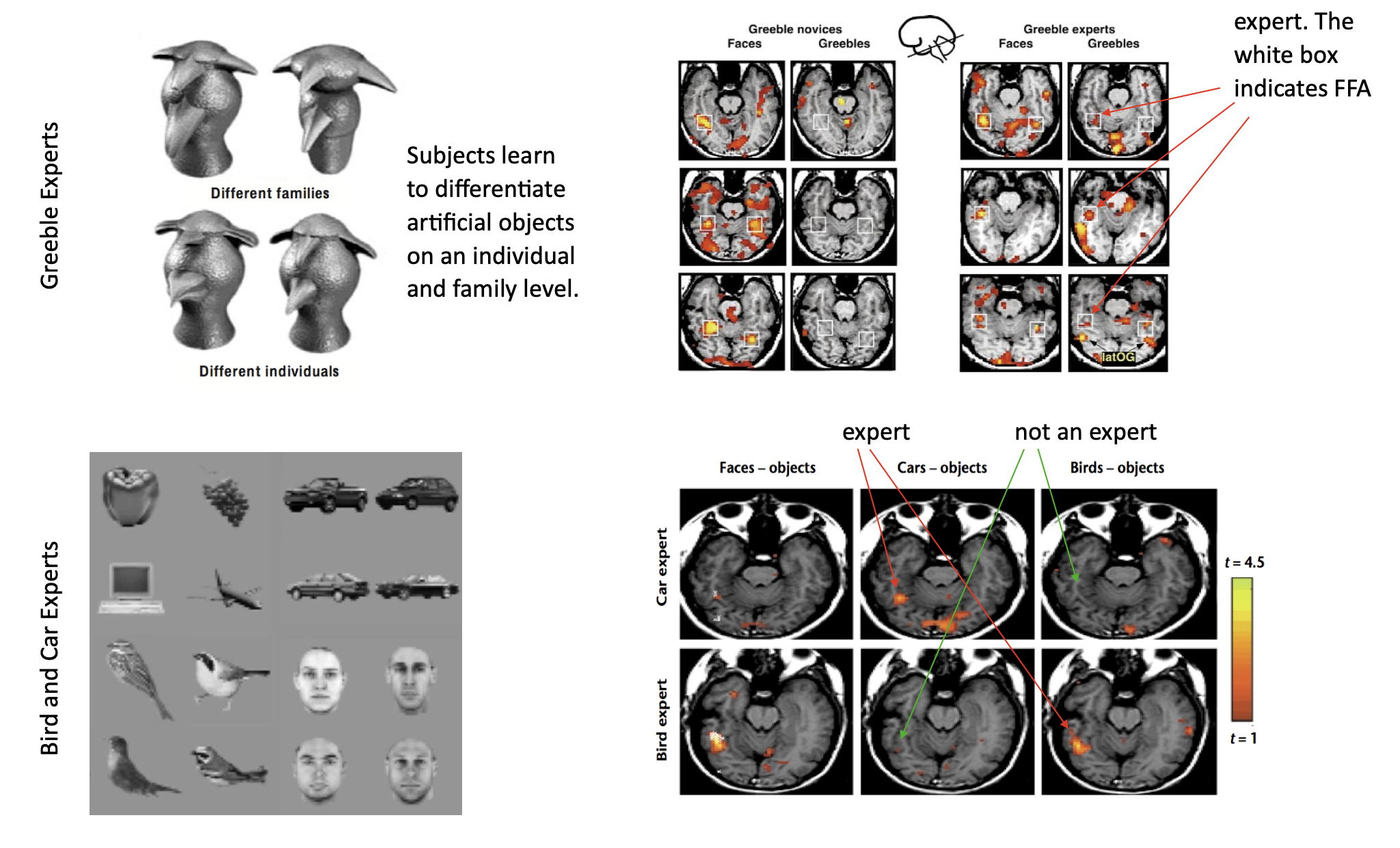 It could be that the FFA is an expert area and we are all exerts on faces. This is why this area is so active. But it is also active when car-experts see cars or bird-experts see birds.